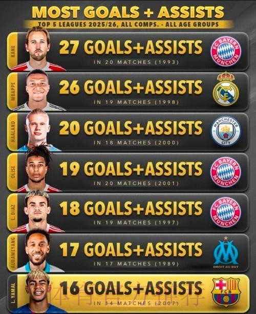 传统观念里,评价前锋往往只看进球数,谁是射手王谁就更出色。但在如今对抗更激烈、节奏更快的五大联赛中,仅凭“进球”早已无法完整刻画一名进攻球员的价值。参与进球这一概念,将进球和助攻都纳入同一坐标系,让我们看到的是“球队每一个进球与某球员之间的联系频率”,从而更直观地衡量他对球队攻击端的综合贡献度。当凯恩在参与进球榜上以27球领跑时,这代表的不只是稳定的破门能力,还意味着他在组织、串联乃至牵制防守上的多重价值都被“计入了账本”。